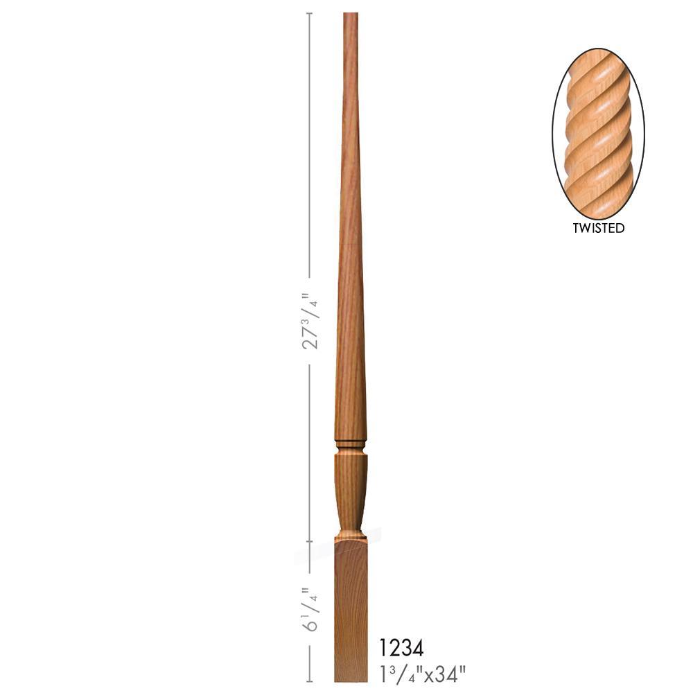 The 1234-T is a Bunker Hill style solid wood baluster. It is available in a plain, fluted, twisted, and octagonal style milling. This baluster is 34 inches tall and 1-3/4 inches wide.