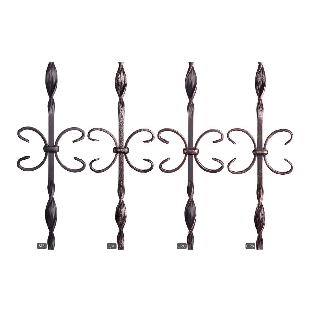 The 16.1.11 Ribbon series iron baluster features a single 12-1/2″ ribbon twist and two 4″ butterflies. This baluster is solid wrought iron and is 1/2″ square. It uses the shoes for the half inch balusters 16.3.19 and 16.3.2. This baluster pairs with all other half inch products.