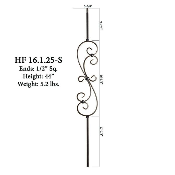 The 16.1.25-S Versatile series iron baluster features a single 16-1/4″ decorative spiral scroll. This baluster is solid wrought iron and is 1/2″ square on the ends. It uses the shoes for the half inch balusters 16.3.19 and 16.3.2. This plain baluster pairs with all other 1/2″ balusters.
