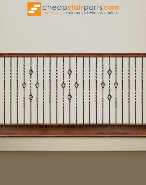 The 16.1.3-T double twist single basket iron baluster features two six inch twists and a single 5-1/2″ basket. This baluster is hollow wrought iron and is 1/2″ square. It uses the shoes for the half inch balusters 16.3.19 and 16.3.2. This single twist baluster pairs with all other half inch products.