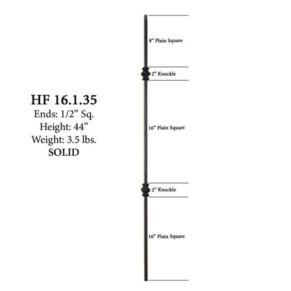 The 16.1.35 Versatile series iron baluster features two 2″ knuckles. This baluster is solid wrought iron and is 1/2″ square. It uses the shoes for the half inch balusters 16.3.19 and 16.3.2. This baluster pairs with all other half inch products.