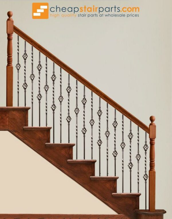 The 16.1.4-T single twist double basket iron baluster features a single 8″ twist and two 5-1/2″ baskets. This baluster is hollow wrought iron and is 1/2″ square. It uses the shoes for the half inch balusters 16.3.19 and 16.3.2. This single twist baluster pairs with all other half inch products.