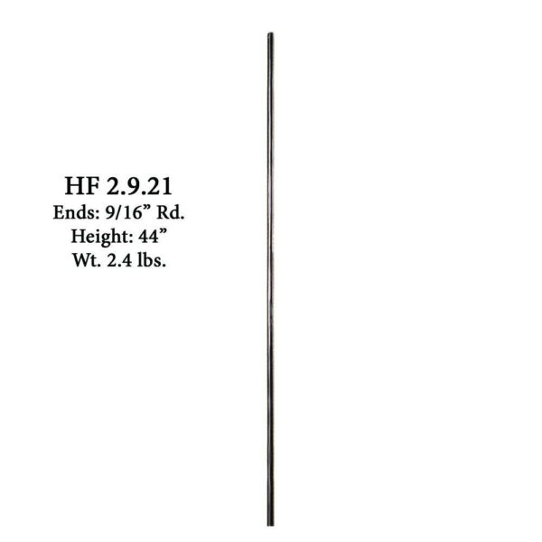 The 2.9.21 Tuscan round series iron baluster features a plain round forged bar. This baluster is solid wrought iron and is 9/16″ round on the ends. It uses the shoes for the nine sixteenth inch balusters 16.3.26 and 16.3.27. This plain baluster pairs with all other Tuscan round series balusters.