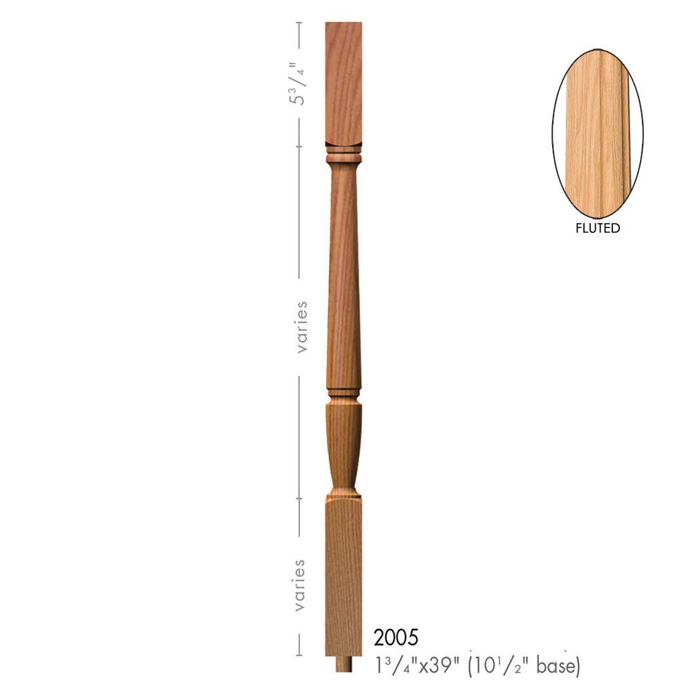 The 2005-39-F is a Bunker Hill style solid wood baluster. It is available in a plain, fluted, twisted, and octagonal style milling. This baluster is 39 inches tall and 1-3/4 inches wide.