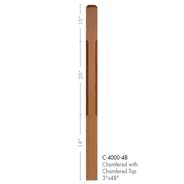 This 4000-48 solid chamfered with chamfered top newel post comes in a variety of wood species. It is available in a plain and fluted style milling. This newel is used in a post-to-post system.