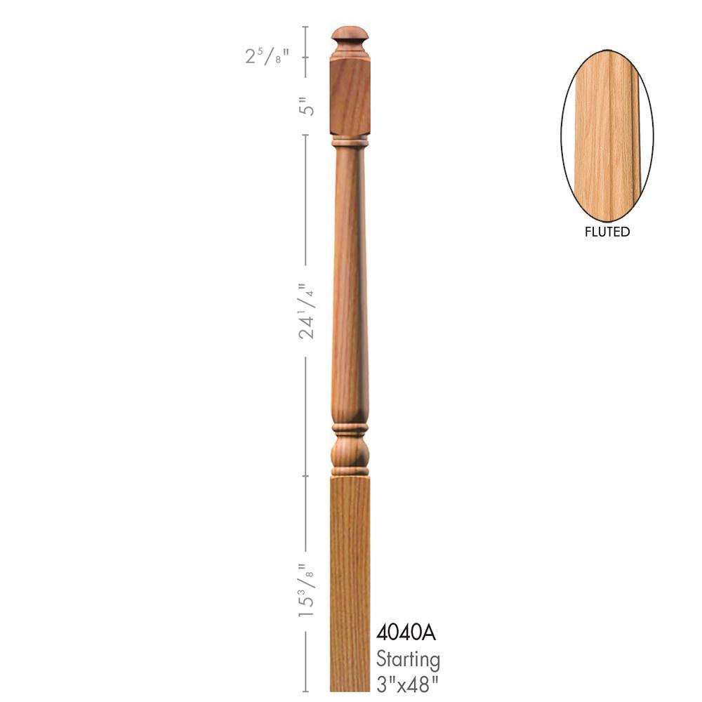 This 4040A-F solid newel post comes in a variety of wood species. It is available in a plain or fluted style milling. This newel is used in a post-to-post system.