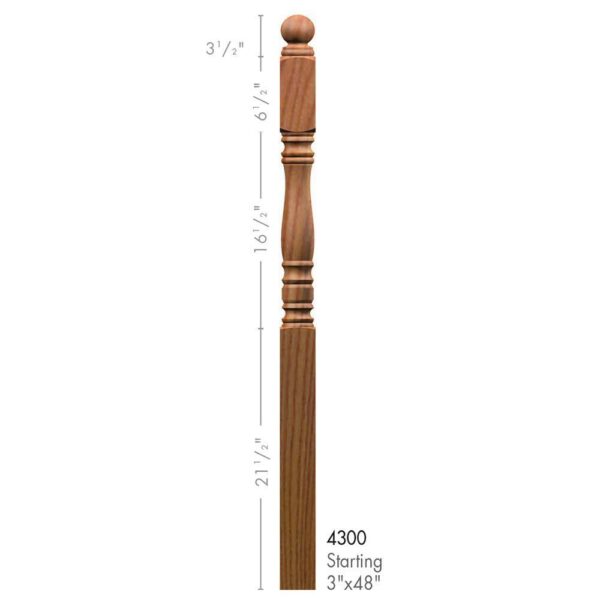 This 4300 solid starting newel post comes in a variety of wood species. It is available in a plain style milling. This newel is used in a post-to-post system.