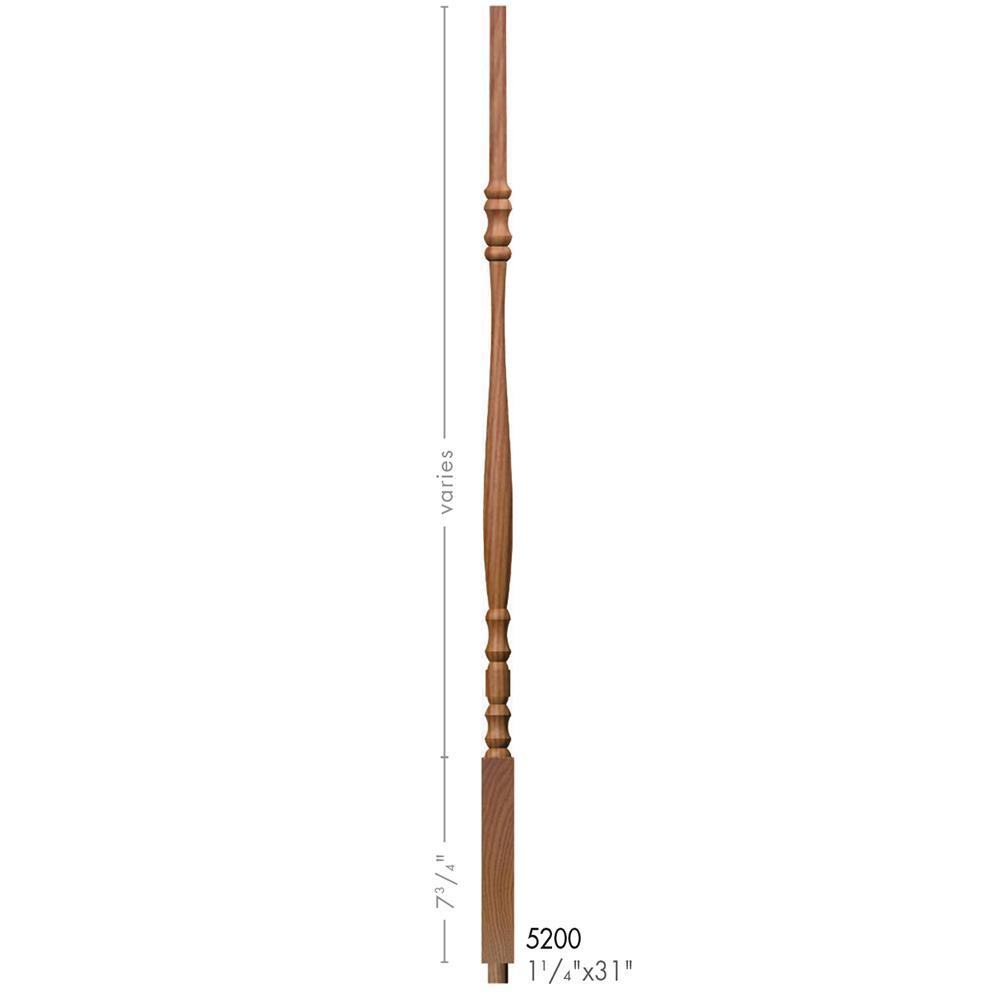 The 5200-31 is a Hampton style solid wood baluster. It is available in a plain style milling. This baluster is 31 inches tall and 1-1/4 inches wide.